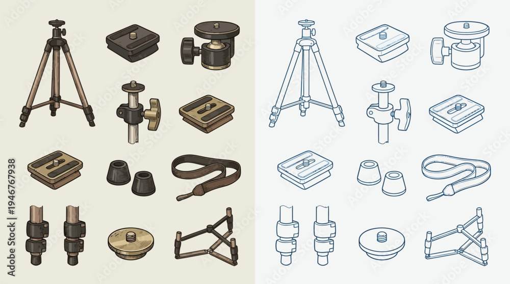 Collection of camera tripod accessories and components, including quick release plates, ball heads, and straps, presented in two distinct illustrative styles. #1946767938