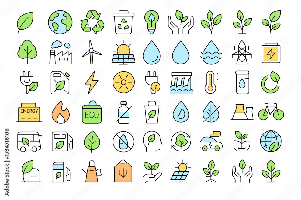 Collection of 30 colored linear vector icons dedicated to ecology, environment protection, and sustainable development. #1734718106