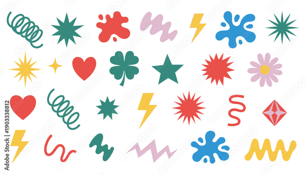 Collection of colorful flat graphic elements including hearts stars lightning bolts splashes zigzags flowers and abstract shapes design symbol icon illustration simple modern #1903338812