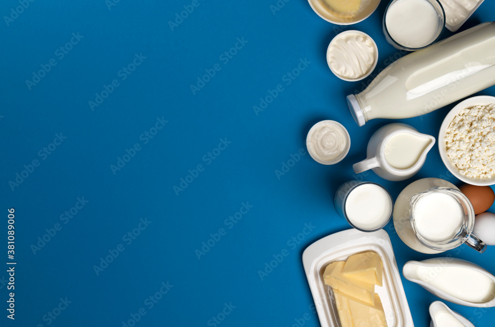Collection of dairy products on blue background, top view #381089006