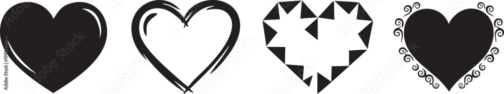 Collection of four distinctive black and white heart shapes with various designs #1949419827