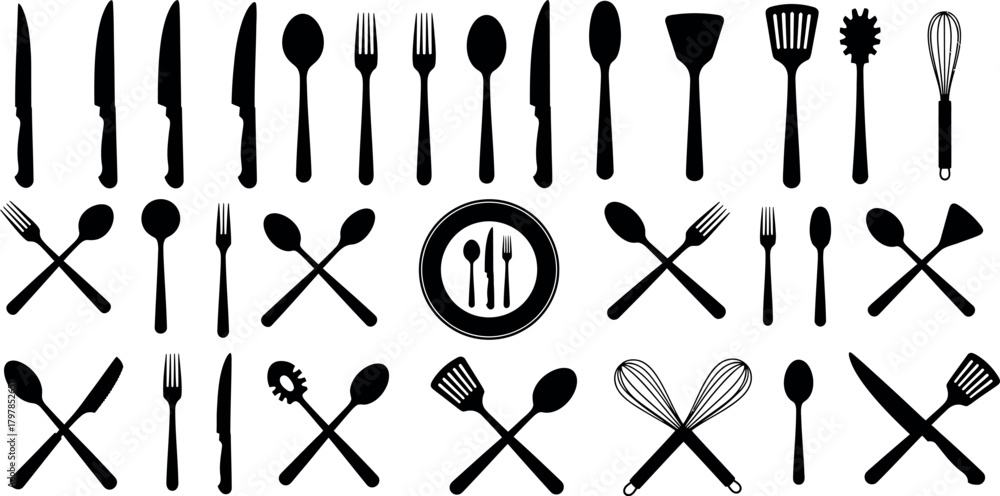Collection of hand drawn black silhouette kitchen utensils and cutlery on white background #1797852651