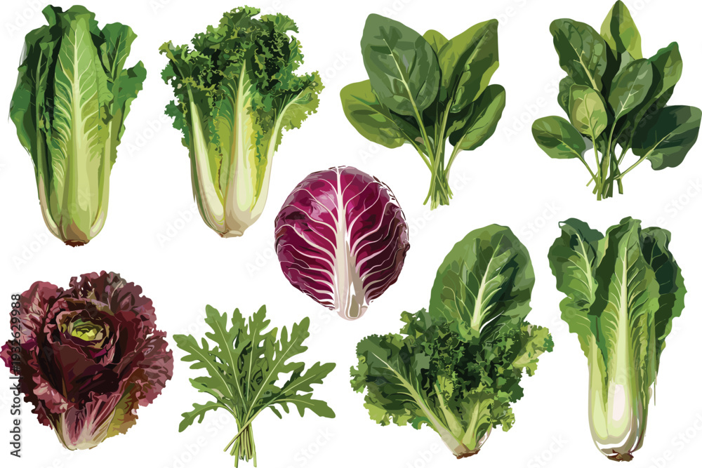 "Collection of illustrated leafy vegetables including lettuce, spinach, arugula, and radicchio, showcasing diverse textures and colors, perfect for culinary, nutrition, gardening, and #1932629988