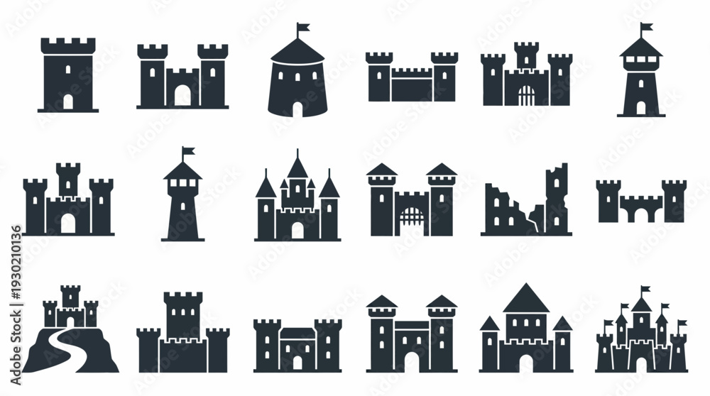Collection of medieval castle silhouettes and fortress tower icons set on isolated white background, concept for game interface design, historical brand identity and architecture mapping #1930210136