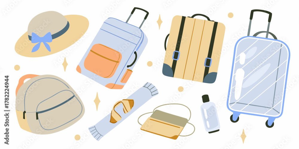 Collection of travel essentials including suitcases backpack hat toiletries and handbag on a white background with sparkling accents #1782224944
