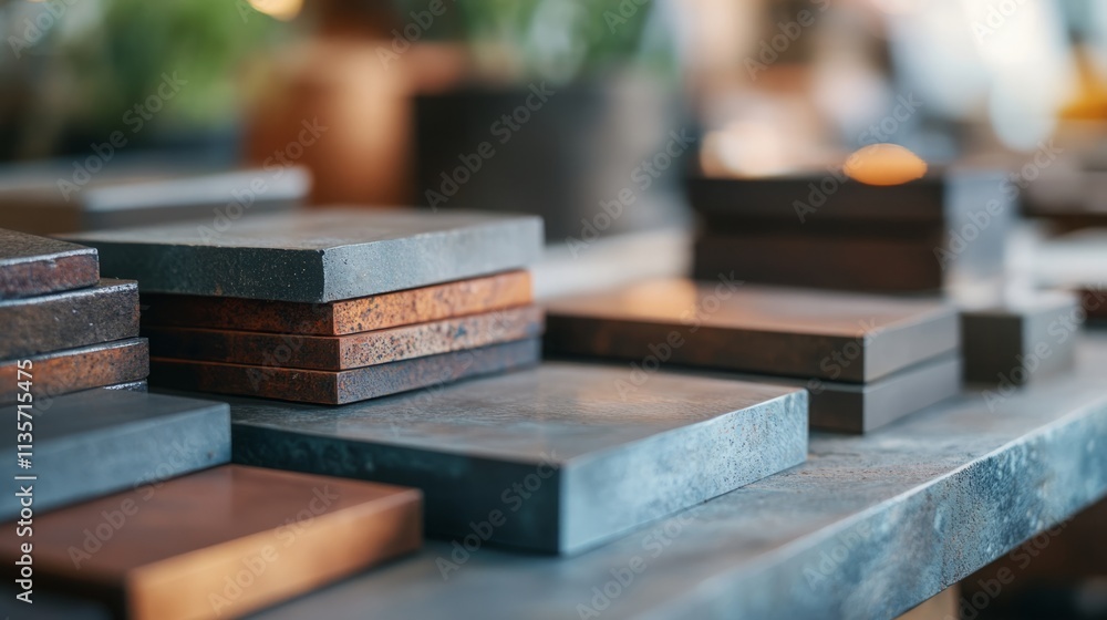 Collection of various metal samples displayed on a table, each labeled with detailed information about unique properties, characteristics, and industrial applications. #1135715475