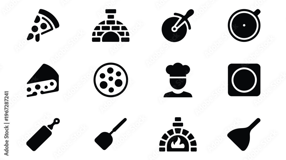 Collection of vector icons representing pizza making and italian cuisine elements including slices cheese toppings ovens and utensils perfect for food service branding and digital #1967287241