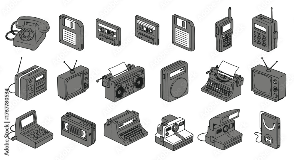 Collection of vintage electronic devices and retro technology icons presented in a clean isometric illustration style on a white background #1767780534