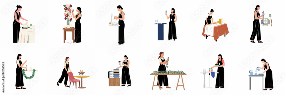Collection of Women Professionals in Black Jumpsuits Managing Wedding Decor, Floral Arrangements, and Table Settings for an Event. #1962860615