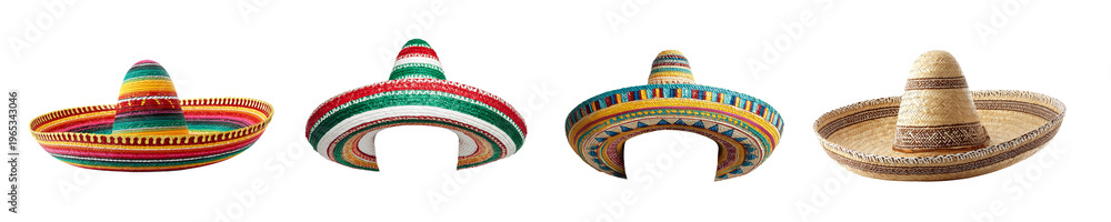 • #1965343046 Collection set of four colorful large mexican sombrero hats isolated on white or transparent background, Cinco de Mayo celebration party collage, png