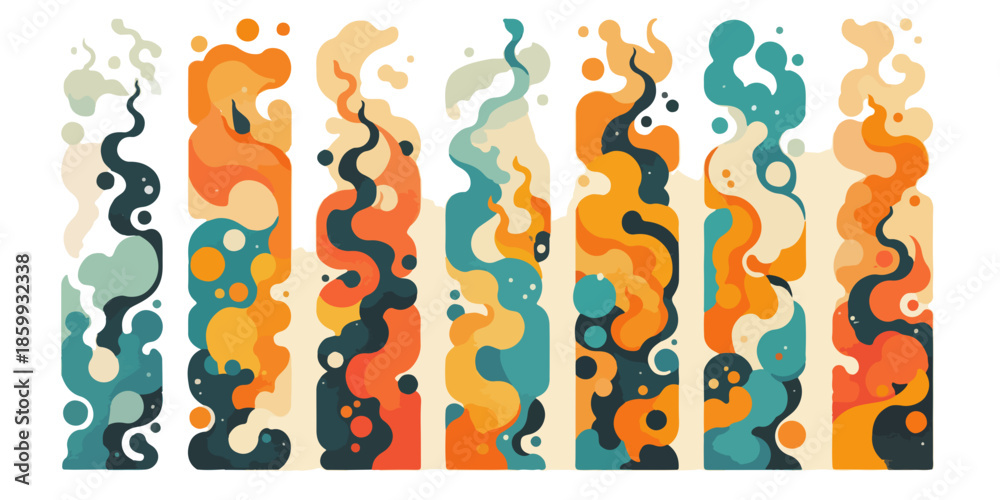 Collezione di elementi grafici astratti verticali con forme organiche fluide in tonalità calde e fredde. #1859932338