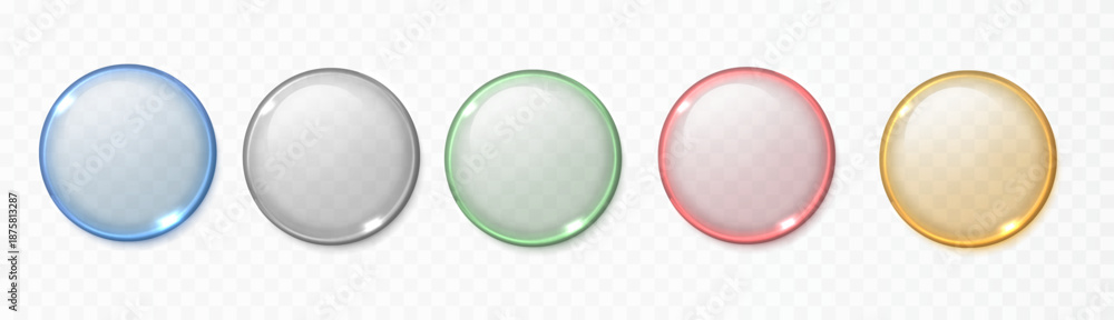 Color 3D glass circle badge with vivid reflections. Transparent glossy lens disc for abstract design, UI elements or futuristic visuals. #1875813287