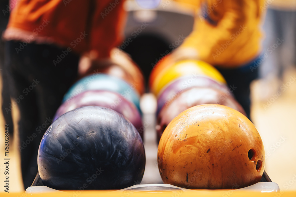 Colorful Bowling Balls in Alley. Family Bowling Entertainment and Recreational Indoor Sports Activity #1753028662