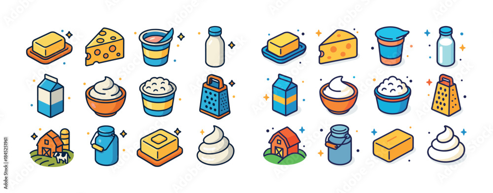 Colorful dairy product illustrations including cheese milk butte #1845251961