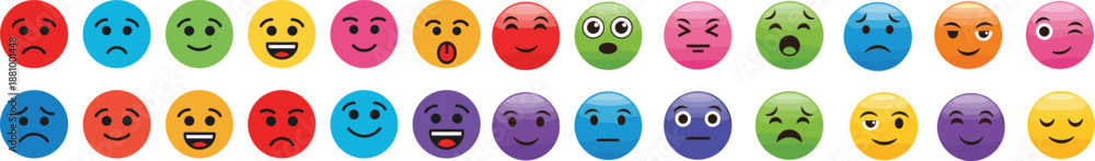 Colorful emoji facial expression vector set. Happy, sad, angry, surprised, and playful emotions in bright round icons. Perfect for apps, social media, stickers. #1881001448