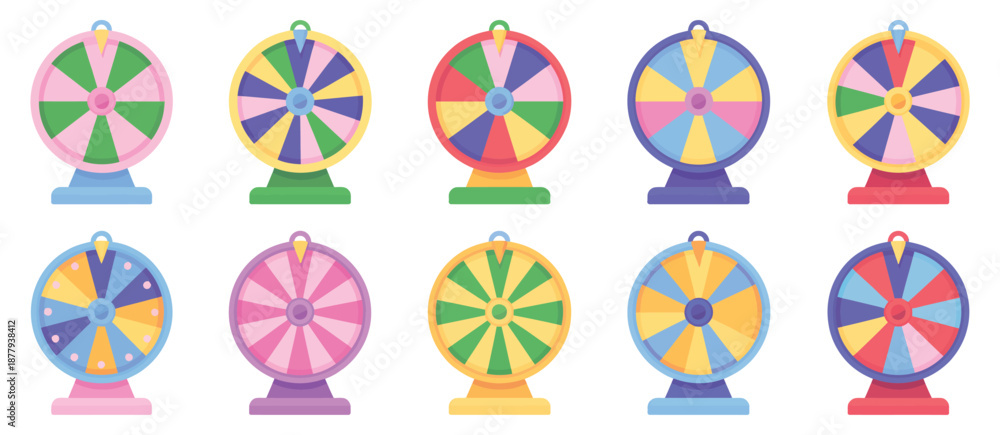 Colorful fortune wheels collection with prize segments, game spin elements for lottery reward and decision making, vibrant wheel of fortune vector illustrations #1877938412