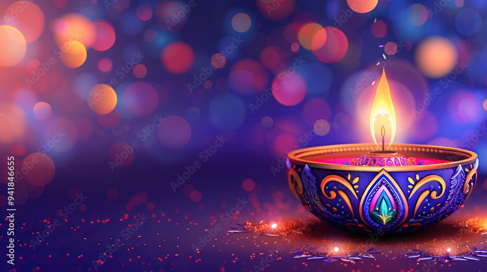 Colorful happy diwali diya oil lamp with flame festive bokeh lights copy space hindu festival celebration #941846655