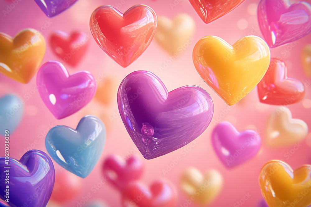 Colorful hearts floating gracefully against a soft pink background for romance #1027098009