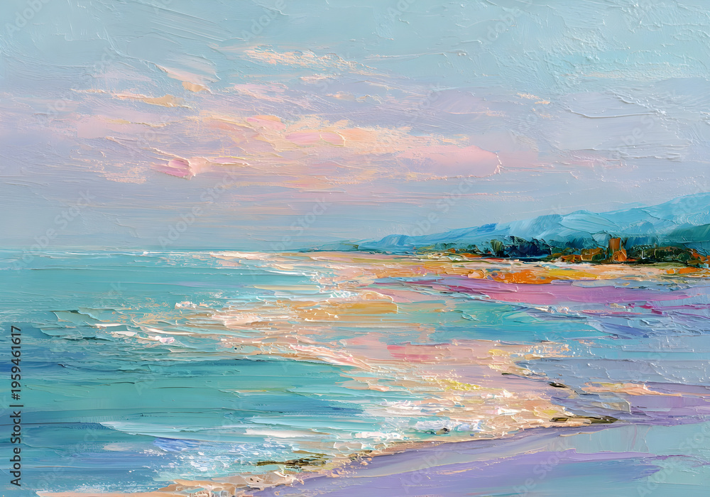 Colorful Impressionist Seascape Painting with Pastel Sky and Ocean Waves Coastal Landscape Art #1959461617