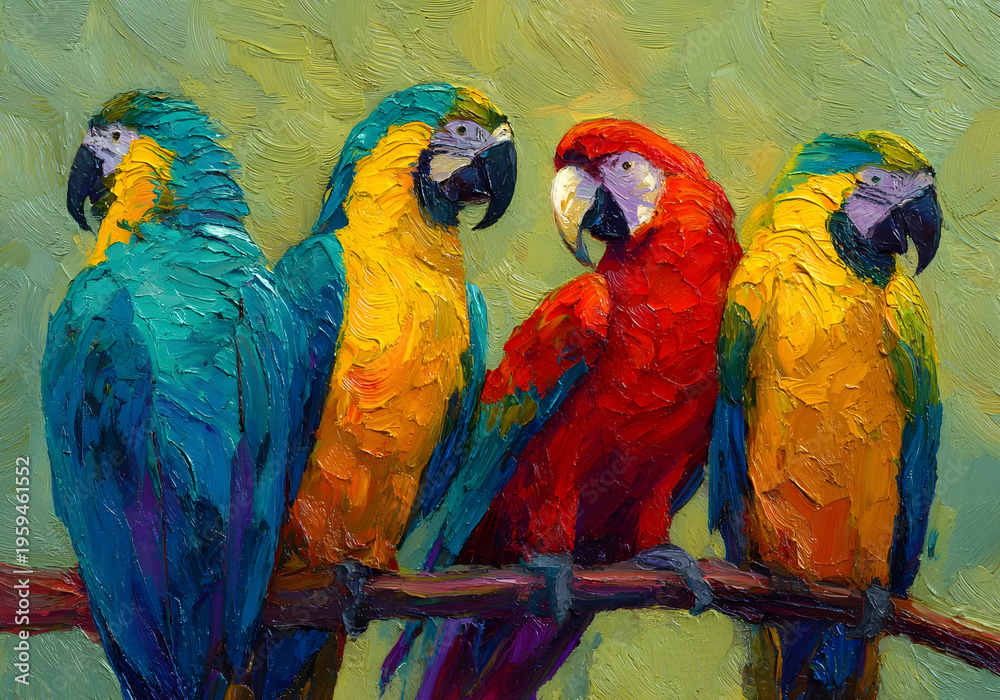 Colorful Parrots on Branch Oil Painting Style Vibrant Tropical Birds Artistic Texture #1959461552