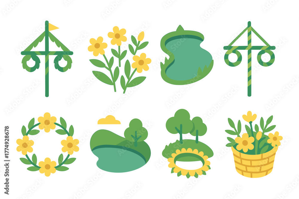 Colorful scandinavian summer symbols celebrating midsummer festivities #1774928678