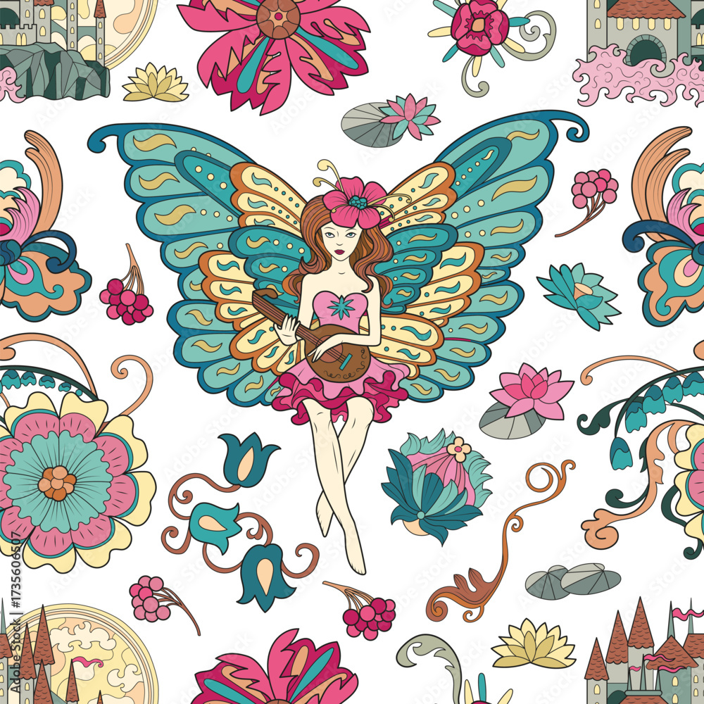 Colorful seamless pattern with fairy girl and fantasy elements on white background for fabric, wallpaper, scrapbooking. Cartoon vector illustration #1735606507