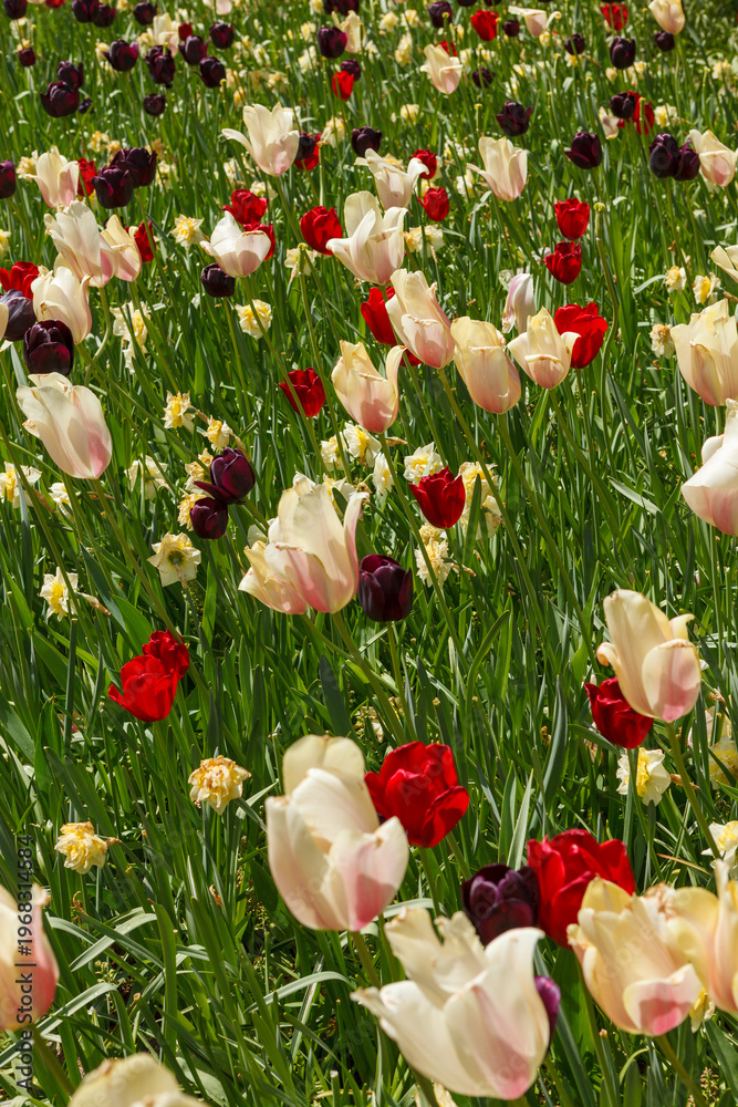 Colorful Spring Tulip Fields Under Bright Sunlight #1968314584
