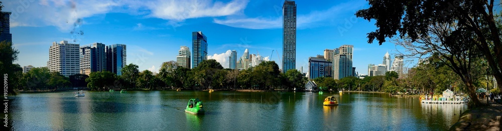 Colorful swan paddle boats glide across the calm lake at Lumpini Park in Bangkok, framed by lush trees and a modern skyline under clear blue skies on a bright afternoon. #1931209985