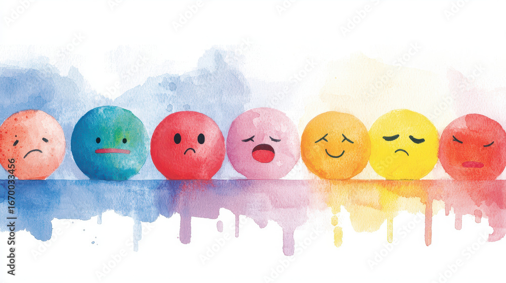 Colorful watercolor illustration of emotive spheres displaying various facial expressions, showcasing range of feelings and emotions #1670033456
