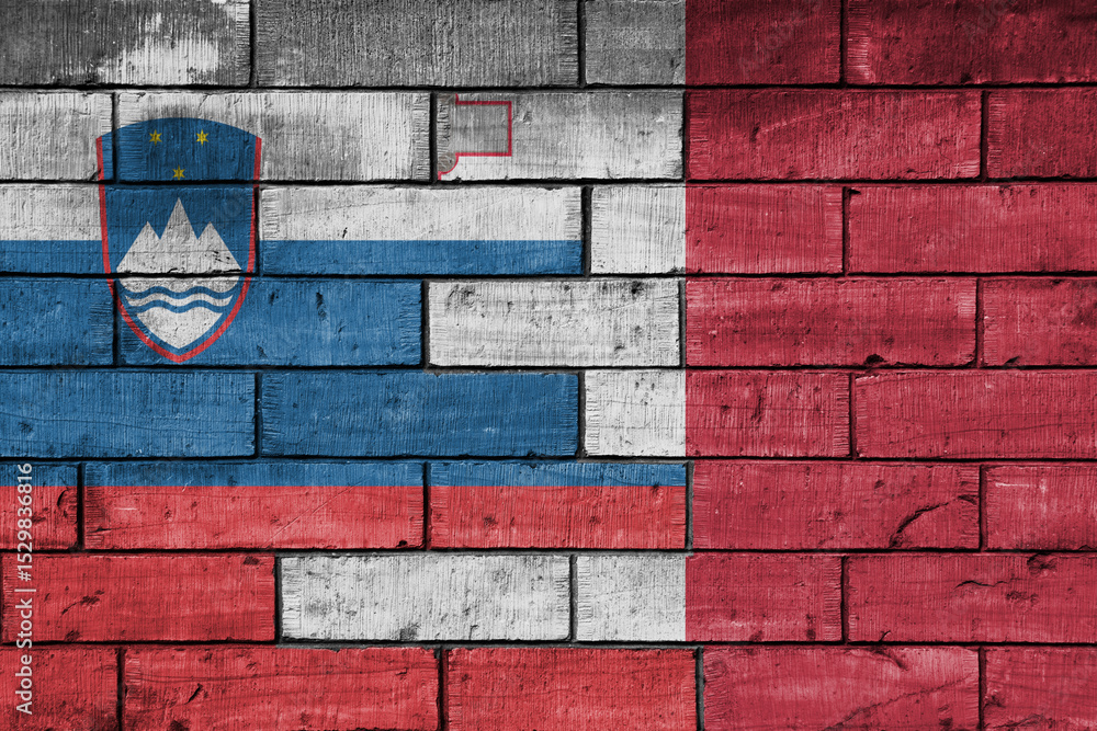colourful painted big national flag of malta and flag of slovenia on a massive old brick wall background. concept #1529836816