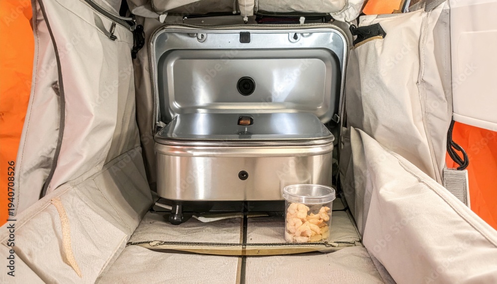 Compact portable food replicator device synthesizing meal components in a kitchen setting, demonstrating future food technology #1940708526
