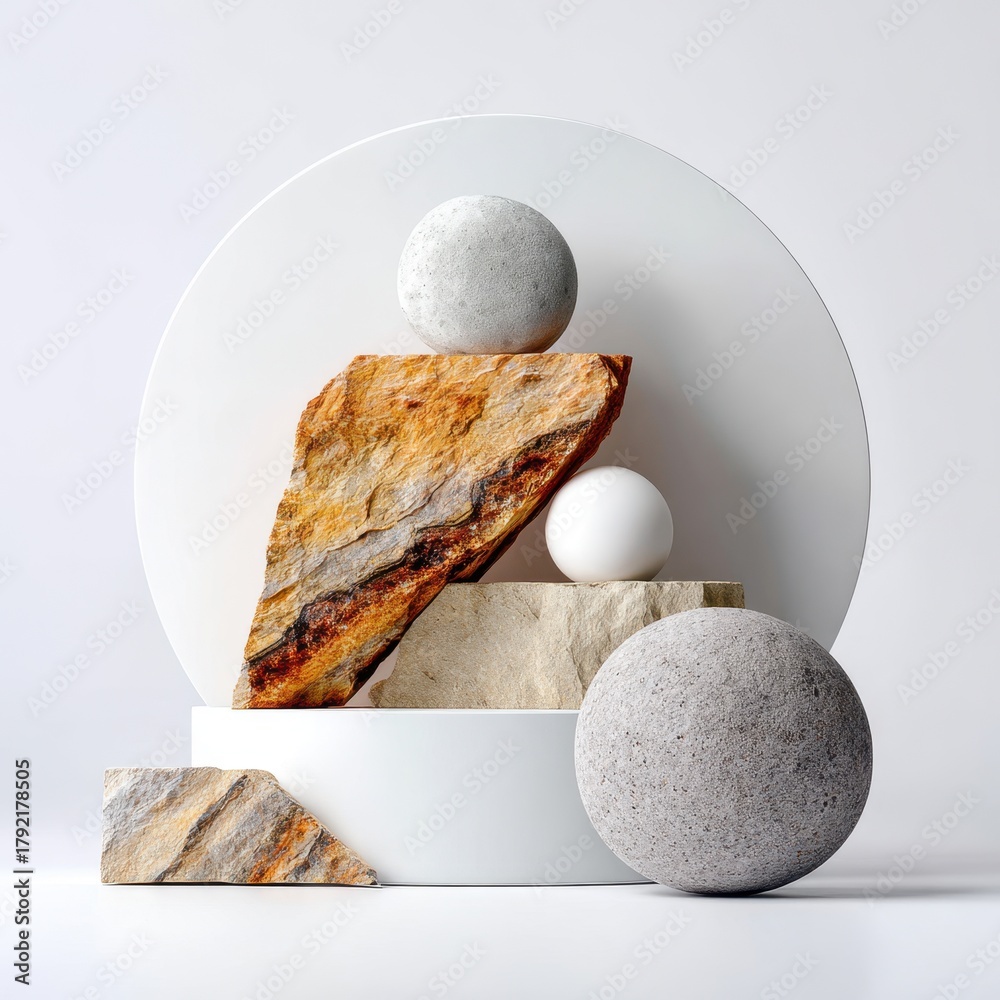 Composition With Stones And Spheres On White Background For Product Mockups And Minimalist Still Life Photography #1792178505