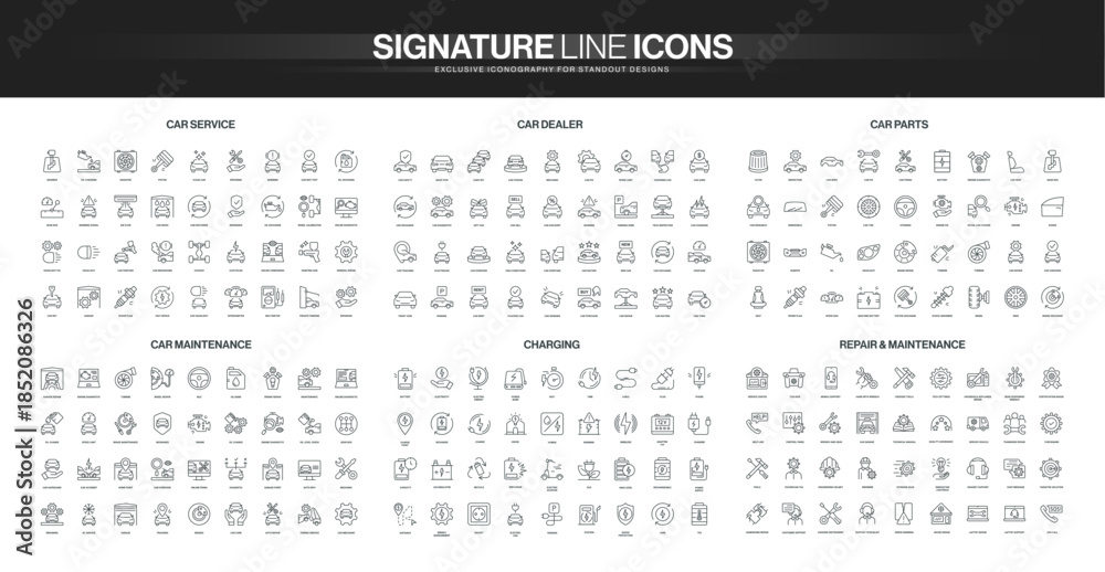 Comprehensive set of thin line icons covering car service, dealership, parts, maintenance, charging, and repair concepts for automotive industry isolated vector illustration #1852086326