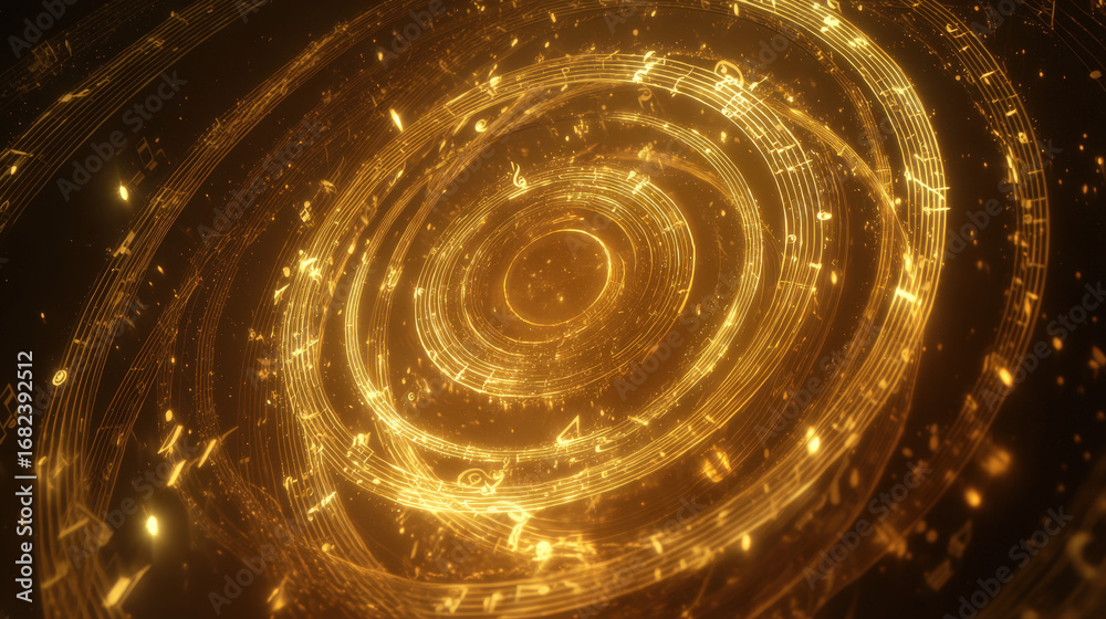 Concentric sound circles with glowing notes illustrate spreading therapeutic music vibrations for mental and physical healing in abstract style #1682392512