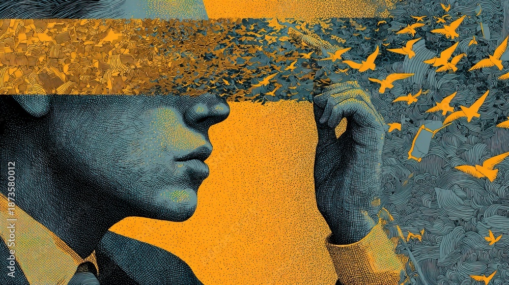 Conceptual Illustration of Mind Transformation with Flock of Bird Metaphor Artwork #1873580012