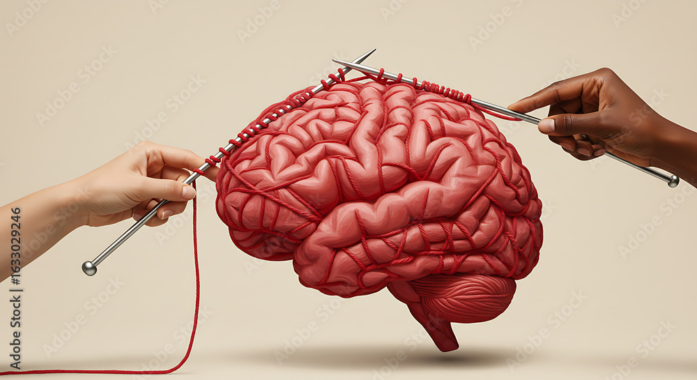 Conceptual illustration of neuroplasticity and brain health, where creative hands knit new neural pathways as a therapeutic hobby. #1633029246