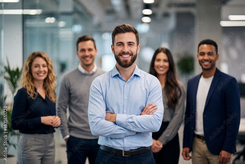 Confident bearded manager with arms crossed posing with diverse team in a modern corporate office #1871651724