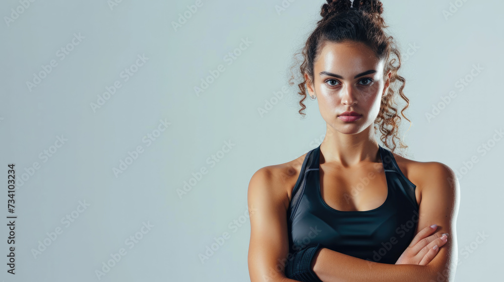 Confident female athlete with crossed arms wearing sportswear on a neutral background. #734103234
