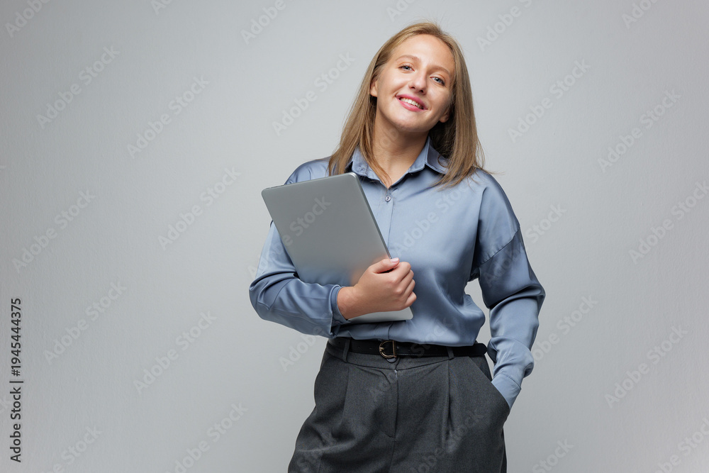 Confident professional woman smiling while holding a laptop in a modern studio environment #1945444375