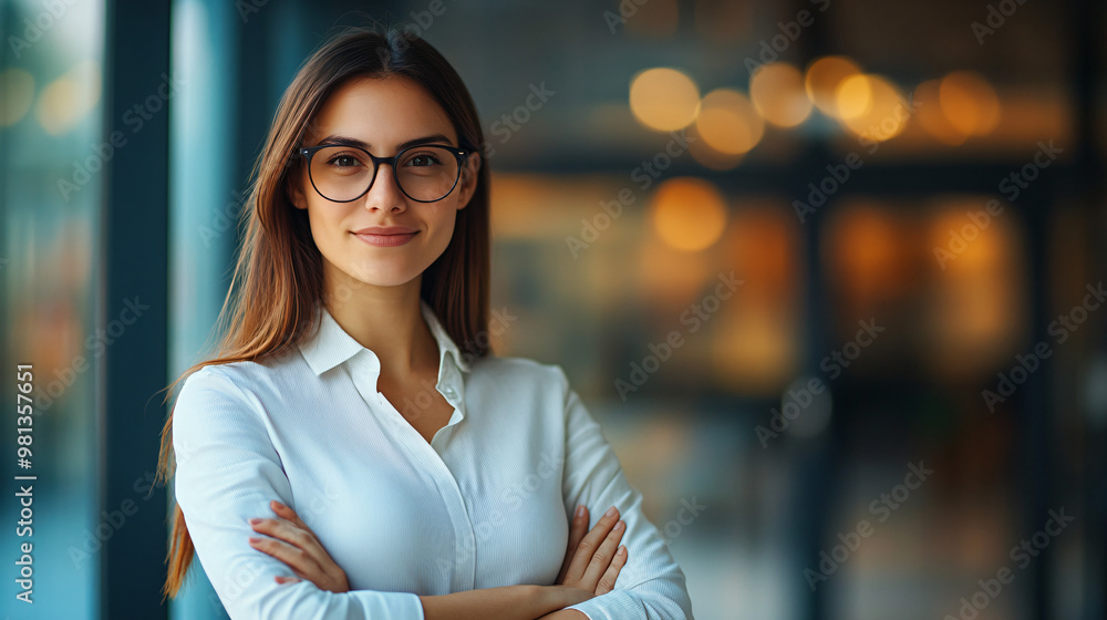Confident young businesswoman smiling with her arms crossed in a contemporary office setting #981357651