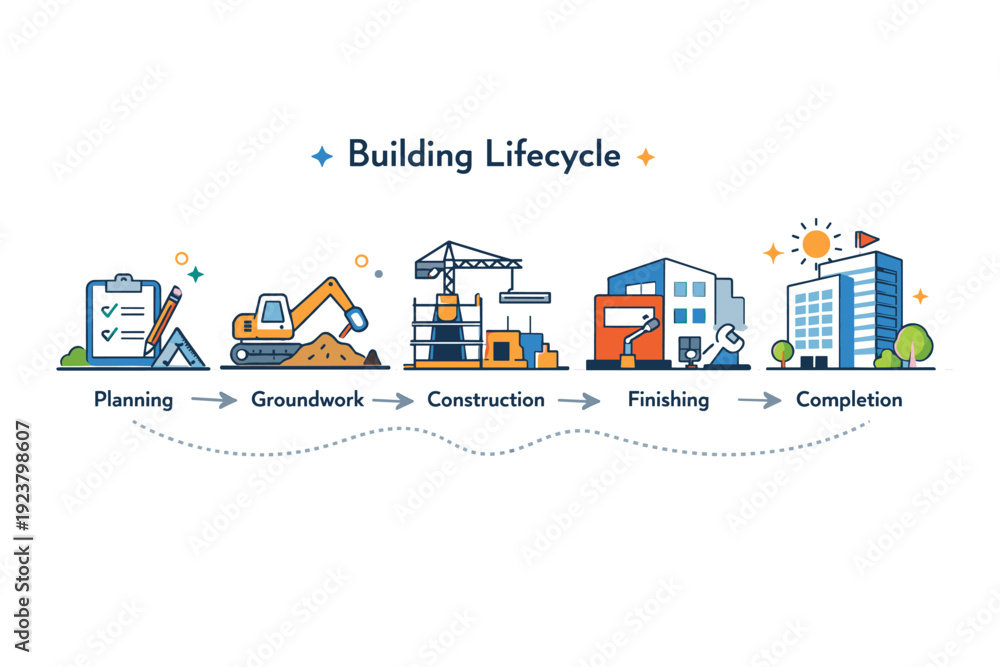 Construction project timeline presenting a complete overview of a building lifecycle. A symbolic scene with phased building icons aligned #1923798607