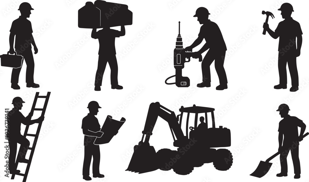 Construction workers silhouette set with tools machinery ladder excavator, builder labor industry vector illustration #1936739141