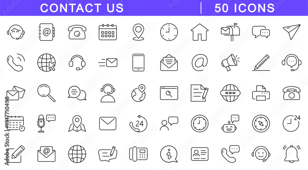 Contact Us icon set. Business contact us icons in line style. Editable web icons for communication, phone, email, contact, website and address. Vector illustration. #1917710498