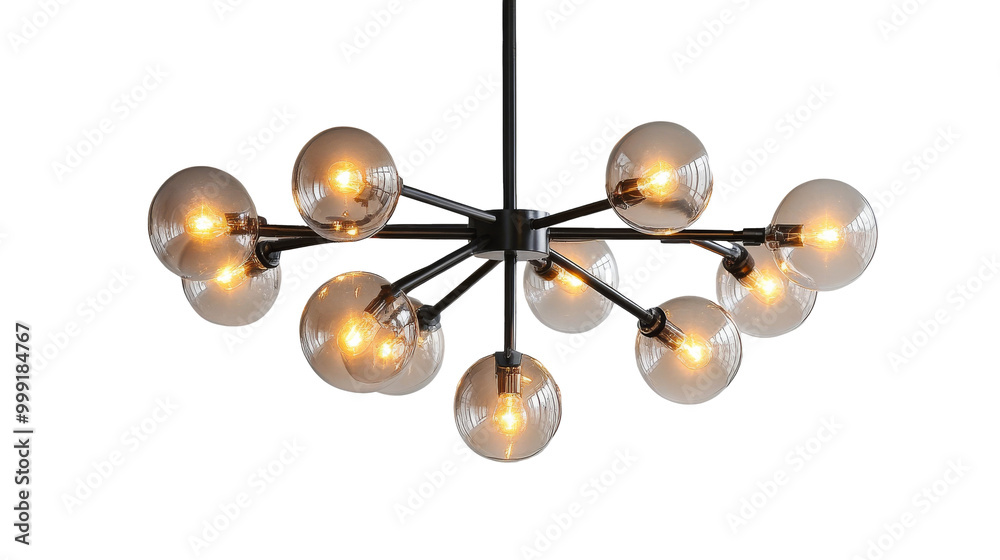 Contemporary chandelier with glass globes, glowing warmly, modern and sleek with geometric shapes isolated on background. #999184767