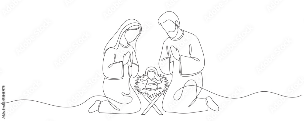 Continuous one line Christmas vector Christian nativity scene of baby Jesus with Mary and Joseph. Bethlehem scene. Editable line #1783689979