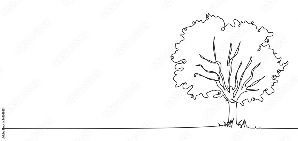 continuous single line drawing of broadleaf tree isolated on white, line art vector illustration #544048491