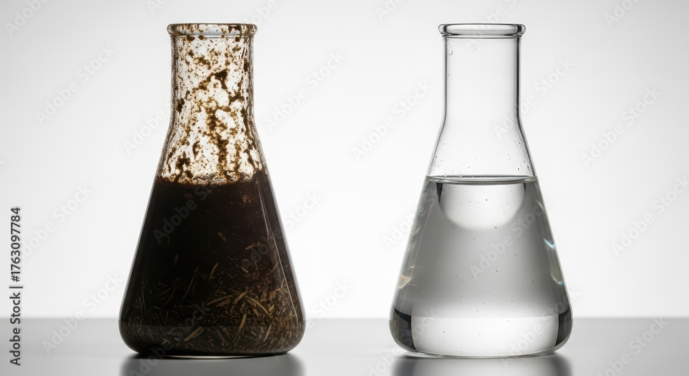Contrasting beakers: dirty water and clean water in erlenmeyer flasks #1763097784
