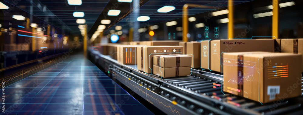 conveyor belt in a distribution warehouse with row of cardboard box packages for e-commerce delivery and automated logistics concepts as wide banner with copysapce area - Generative AI #619992102