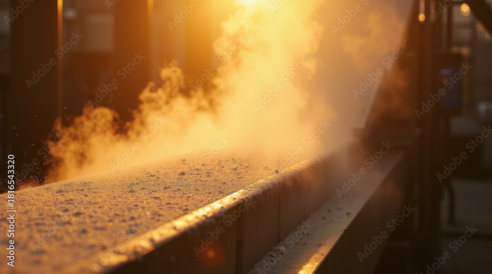 Conveyor belt wheat flour dust explosion risk illuminated beams golden haze machinery #1816543320