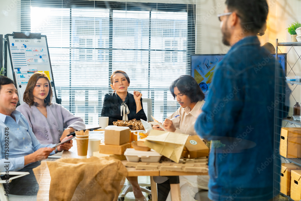 Corporate business team meeting discussion working plan in office room. Asian man employee writing on glass board presentation reusable Eco friendly product to colleague teamwork and project manager. #1753802478